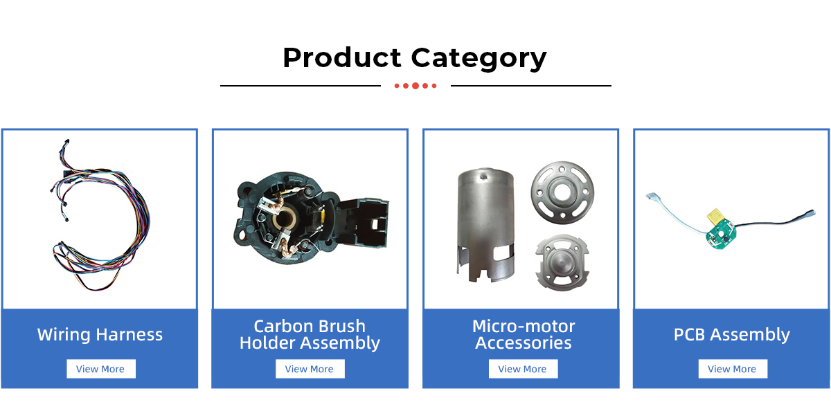 Productos principales:Arnés de cableado, soporte de escobilla de carbón, accesorios de micromotor, montaje de placa de circuito impreso